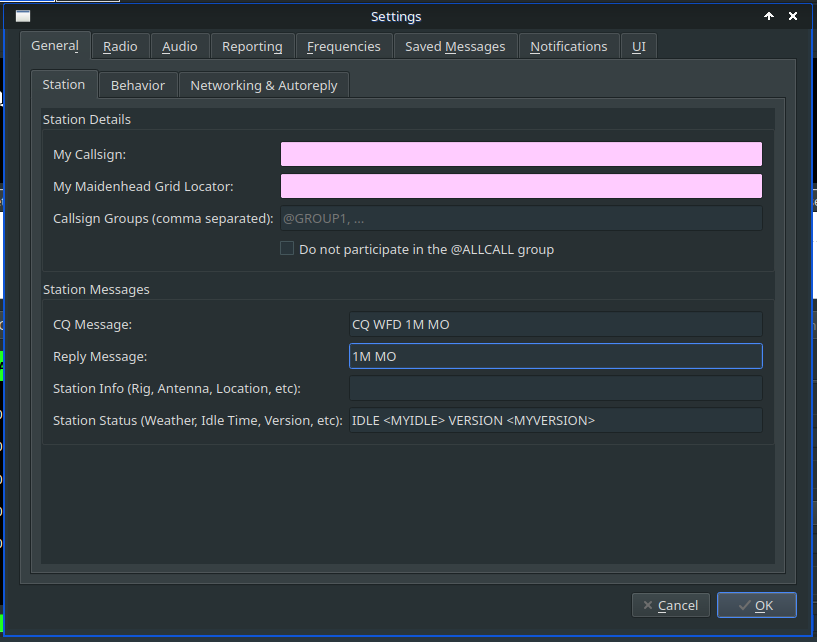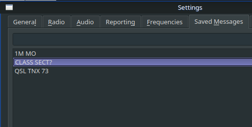 Now, go back to the settings window and head over to the Saved Messages tab. You can store a few quick replies to minimize the typing you have to do for WFD. One should be your exchange. Another should be some kind of 73 message. The other, and this is very important, should be a request for the other station's exchange. I promise you, you'll wish you had this after the millionth station tries to contact you and doesn't send the exchange. You can add all kinds of other stuff as you see fit. I like to keep it simple for WFD.