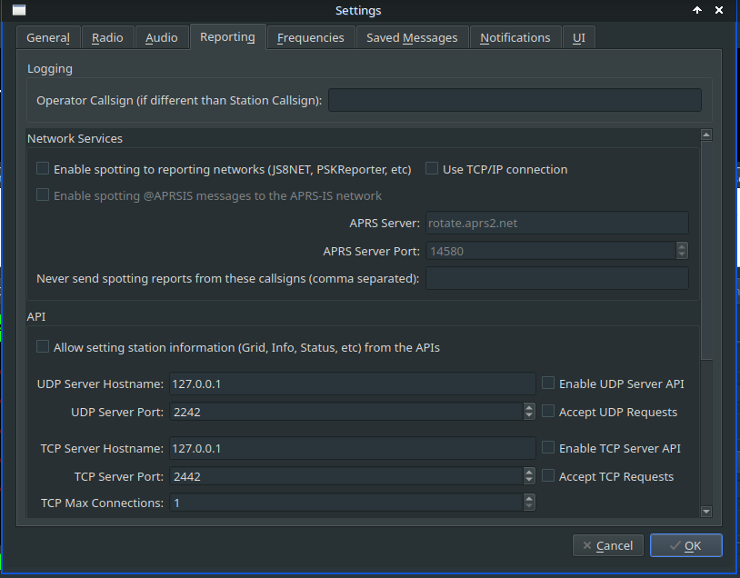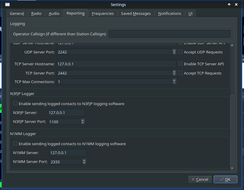 If you're running N3FJP or N1MM, use the settings at the bottom of the Reporting tab to configure those.