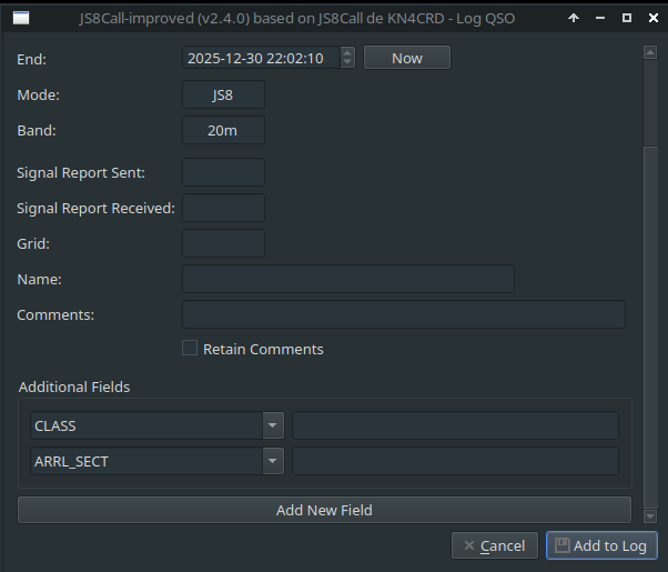 Click it. On the left, you can use the drop-down menu or start typing CLASS. Then do the same again except type or select ARRL_SECT. Once those two are added, you can cancel out of the log entry window and those fields will remain for future log entries. You can select the class/category and section in the received messages area and click the corresponding fields on the log form to add them (thanks to Ben for reminding me of that feature). You can also just type them in.