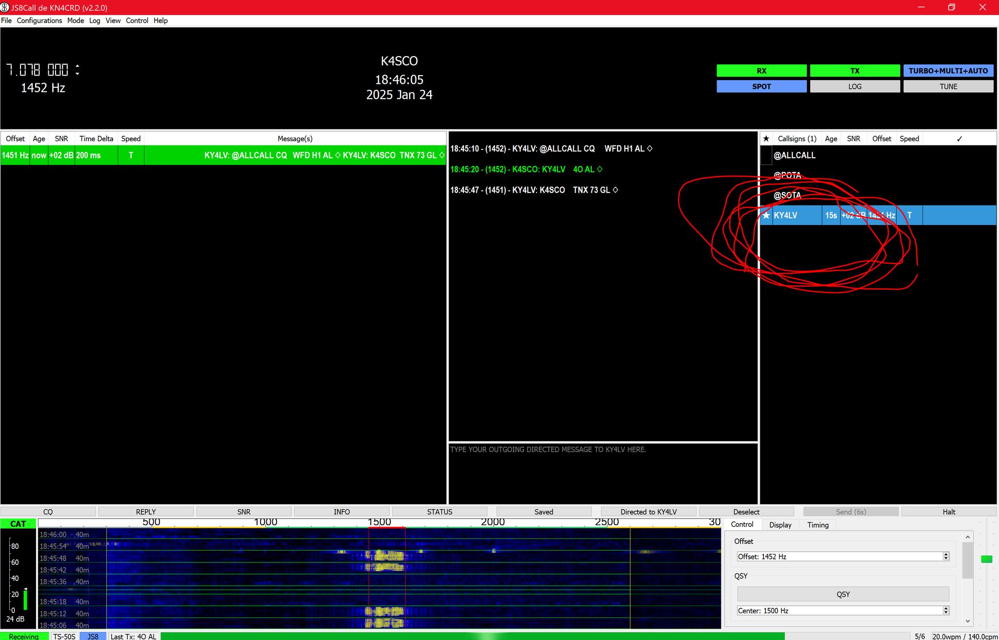 One last thing, and this is just a general JS8Call user thing, but it's really important. PLEASE select the station you're trying to work before sending your message. If you don't, there's no way for that station to know you're talking to them.